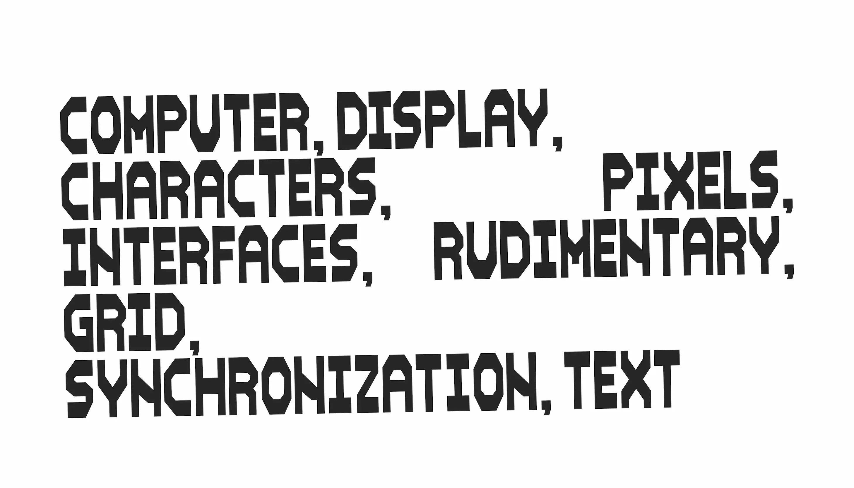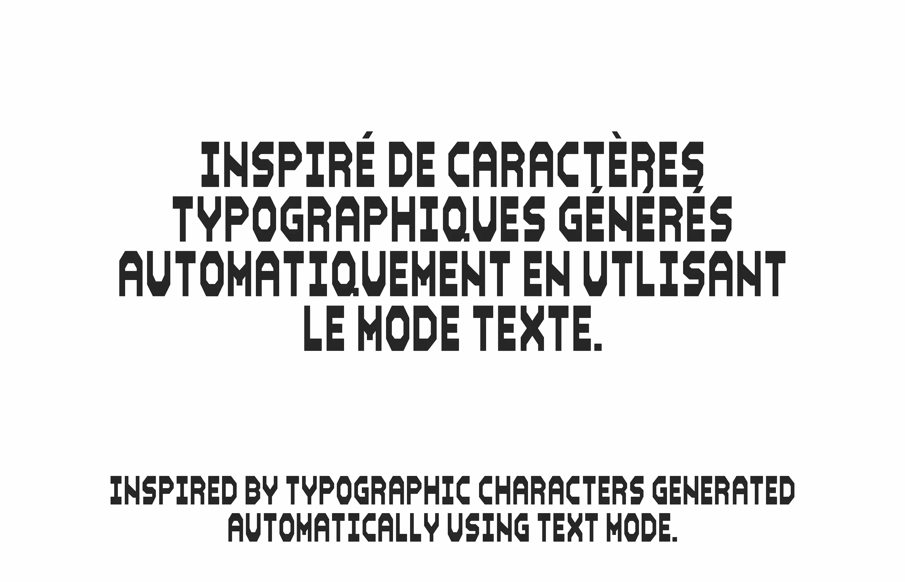 MODE TEXT est une police de caractères display qui rend hommage aux premières typographies numériques générées automatiquement. S’inspirant des premières expérimentations typographiques des débuts de l’informatique, elle réinterprète cette esthétique en introduisant des formes contrastées, apportant ainsi une touche contemporaine et un regard nouveau sur les polices de caractères souvent négligées dans les documents quotidiens.